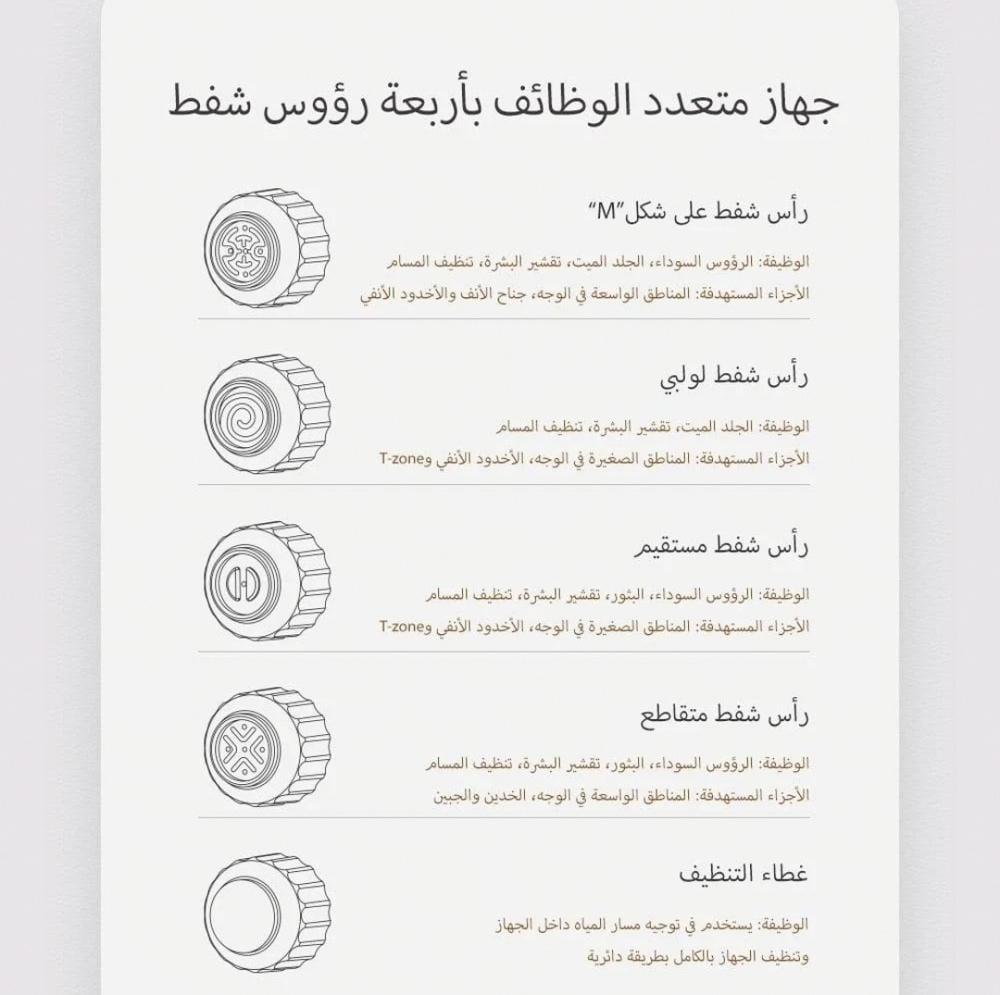 - يعمل الجهاز على تقشير الوجة والمناطق الاخرى بدون الم وازالة الشوائب وبقايا المكياج والرؤوس السوداء